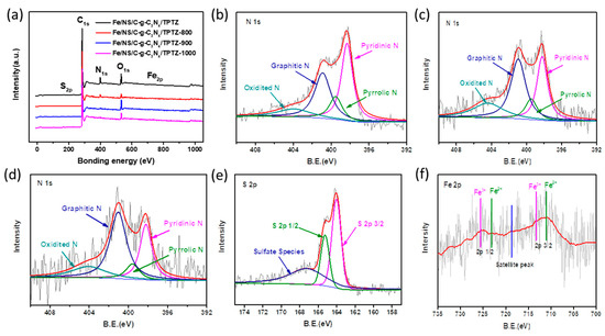 (a) XPS survey spectra of Fe/NS/C-g-C3N4/TPTZ and Fe/NS/C-g-C3N4/TPTZ-T (T = 800, 900, 1000); high-resolution N 1s spectra of (b) Fe/NS/C-g-C3N4/TPTZ-800, (c) Fe/NS/C-g-C3N4/TPTZ-900 and (d) Fe/NS/C-g-C3N4/TPTZ-1000; (e) high-resolution S 2p spectrum and (f) Fe 2p spectrum of Fe/NS/C-g-C3N4/TPTZ-1000.