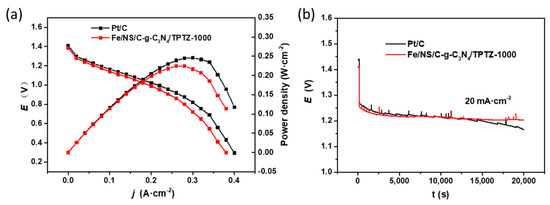 To further evaluate the potential for practical application, the Fe/NS/C-g-C3N4/TPTZ-1000 was assembled into a homemade primary Zn-air battery as cathode catalyst. Figure 8a presents the polarization curves of Zn-air batteries with Fe/NS/C-g-C3N4/TPTZ-1000 and Pt/C as cathodes, respectively. The Zn-air battery with Fe/NS/C-g-C3N4/TPTZ-1000 catalyst exhibits an open-circuit voltage (OCV) of 1.385 V and a maximal power density of 225 mW cm−2 at a temperature of ca. 25 °C, which is quite comparable to that of Pt/C with the OCV of 1.411 V and the maximal power density of 246 mW cm−2. This performance outperforms the most of Zn-Air batteries utilizing analogous Fe-N-C cathode reported so far [37,38,39,40]. In the meantime, the long-term stability of a Zn-air battery with Fe/NS/C-g-C3N4/TPTZ-1000 was also tested by recording the galvanostatic discharge curves. As presented in Figure 8b, the Zn-Air battery with Fe/NS/C-g-C3N4/TPTZ-1000 catalyst only presents a voltage loss of 4.03% after 20,000 s at a current density of 20 mA cm−2. For the Pt/C, the output voltage loss reaches 8.17% under the same conditions, demonstrating the improved durability of the Fe/NS/C-g-C3N4/TPTZ-1000. The slight fluctuation may due to the disturbance of testing circumstance such as humidity, which cannot be completely avoided. These results suggest that the as-prepared Fe/NS/C-g-C3N4/TPTZ-1000 catalyst has great potential to replace the precious metal catalysts in practical application of Zn-air battery.