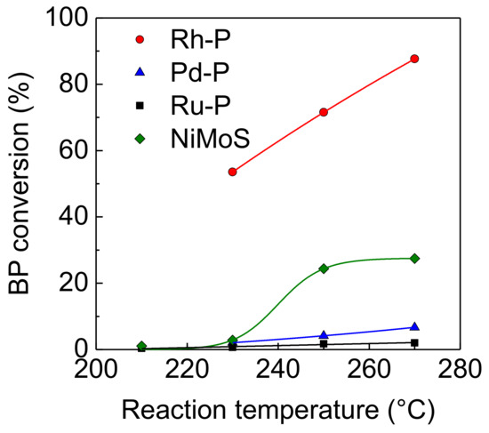 Transition metal phosphide catalysts have high potential for the HDS reaction [2,3,5,8,9,10,11,12,13,14,15]. On the other hand, noble metal phosphides (NMXPY) [16,17,18,19], especially rhodium phosphide (Rh2P), showed high and stable HDS activity. It is well known that noble metals (NM: Rh, Pd, Ru, Pt) have higher hydrogenating ability than transition metals. Thus, NMXPY catalysts also would have high hydrogenating abilities, and these catalysts would also show high activities for the HDS of refractory organic sulfur compounds. However, the activities of NMXPY catalysts for hydrogenation of aromatic compounds have not been reported. Bussell’s group reported that Rh2P showed higher catalytic activity for the HDS of dibenzothiophene (DBT) than Rh2S3 [20]. They also reported that Pd and Ru phosphide catalysts exhibited lower activity for the HDS of DBT than its sulfide catalysts [21]. However, activity for the HDS of 4,6-DMDBT should be evaluated to develop highly active NMXPY catalysts for the HDS of heavy oil. We found that the HDS activity of Pt catalysts decreased with increasing P loading [16,18]. Thus, we examined the hydrogenation and HDS activities of P-added NM (NM-P), such as Rh-P, Pd-P, and Ru-P, catalysts. Since increasing the reduction temperature causes the formation and sintering of NMXPY species, the optimal reduction temperature for HDS activities of NM-P/SiO2 catalysts were clearly observed [16,17,18,19].