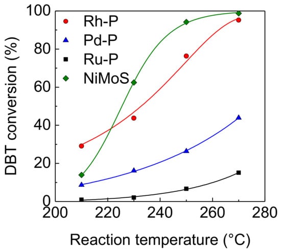 The effect of reaction temperature on the activities of NM-P and NiMoS catalysts for the HDS of DBT was examined. At a lower temperature (210 °C), the Rh-P catalyst showed the highest HDS activity, as shown in Figure 2. The order of the HDS activities at this temperature was as follows: Rh-P > NiMoS > Pd-P > Ru-P. This order was the same as that of the hydrogenation activities, indicating that hydrogenation activity is one of the important factors to decide HDS activity. The HDS activity of the Rh-P catalyst increased with increasing reaction temperature. The same trend was observed in other catalysts. Above 230 °C, the NiMoS catalyst exhibited the highest HDS activity.
