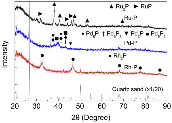 Around 20–30°, a broad peak of amorphous SiO2 support appeared. In the Rh-P catalyst, phase pure Rh2P (00-002-1299) [25] remained after the HDS reaction. However, some NMXPY phases were observed in the spent Pd-P and Ru-P catalysts. In the spent Pd-P catalyst, many phosphide species (Pd6P (01-071-2254), Pd9P2 (Pd4.8P, 00-019-0890), Pd3P (03-065-2415), and Pd5P2 (00-023-0465) [25]), were observed. On the other hand, two phosphide species (Ru2P (01-089-3031) and RuP (01-074-6496) [25]) were observed in the XRD pattern of the spent Ru-P catalyst. We found that the peaks for Ru2P and Ru were observed in the XRD pattern of the Ru-P catalyst before the HDS reaction (after reduction at 650 °C) [18]. The difference between these results can be explained by as follows; the reduction of excess phosphate was facilited by H2 at 2.5 MPa and Ru2P reacted with phosphorus species to form RuP. In any case, the peaks for Rh2P, Pd6P, Pd9P2, Pd3P, Pd5P2, Ru2P, and RuP were observed in the XRD patterns of the spent NM-P catalysts, and the peaks for sulfides did not appear. These results indicate that NMXPY species possess high sulfur tolerance.