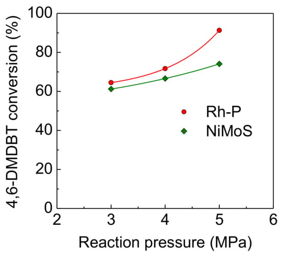 On the other hand, in spite of increasing reaction pressure, the HDS activities of the NiMoS catalyst were unstable (as shown in Figure 6) compared to the Rh-P catalyst. Furthermore, at a higher pressure (5.0 MPa), the HDS conversion at 1 h was higher than that at 1.5 h. It has been reported that the sulfidation degree of Mo is one of the important factors to control catalytic activity [4,26,27]. Since the sulfided NiMo catalyst was exposed to high pressure H2 (at 5.0 MPa) before the HDS reaction (at 310 °C), the reduced NiMoS catalyst would show lower HDS activity. However, H2S, which is obtained by the HDS reaction, or 4,6-DMDBT reacts with reduced NiMoS to increase the sulfidation degree. Thus, at the initial stage, the HDS activity of the NiMoS catalyst would be enhanced by re-sulfidation in the HDS reaction. Figure 7 shows the effect of reaction pressure on the HDS activities of Rh-P and NiMoS catalysts. For the NiMoS catalyst, the HDS activity slightly increased with increasing reaction pressure. On the other hand, the HDS activity of the Rh-P catalyst significantly increased with increasing reaction pressure.