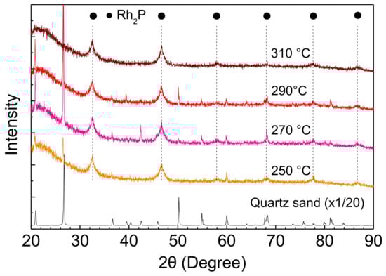 The XRD patterns of the spent catalysts were measured using a Ultima IV (Rigaku, Tokyo, Japan) equipped with a Cu Kα radiation source operated at 40 kV and 40 mA. The crystallite size of the Rh2P was calculated using Scherrer’s equation: