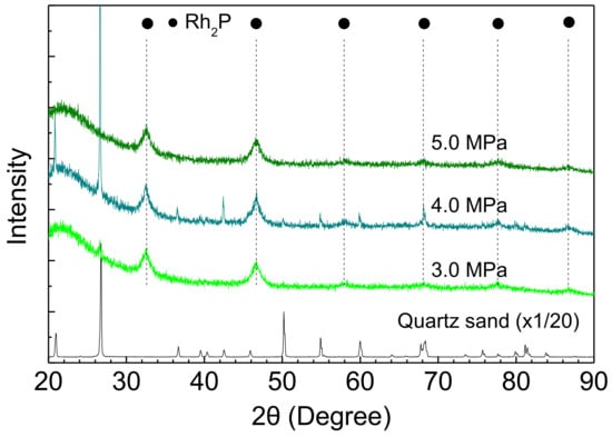XRD patterns of Rh-P catalysts after the HDS of 4,6-DMDBT at different reaction pressures.