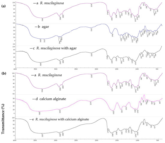 For the immobilization of whole cells on calcium alginate, the FTIR spectra of free cells, calcium alginate and immobilized cells are shown in Figure 1b [(a) is for free cells; (d) is for calcium alginate; (e) is for immobilized cells on calcium alginate]. Figure 1b (d) shows characteristic peaks at 3428 cm−1 (O–H trenching), 2930 cm−1 (C–H stretching), 1032 cm−1 (C–O–C stretching), 1623 cm−1 and 1419 cm−1 (–COO asymmetric and symmetric stretching) for calcium alginate. The FTIR results support that the immobilization reaction occurred, as the peaks for the whole cells immobilized on calcium alginate show changes relative to the position and intensity of the characteristic peaks for native calcium alginate]. The presence of additional peaks at 1743 cm−1 and 1548 cm−1 [Figure 1b (e)] confirms that the immobilization reaction occurred.