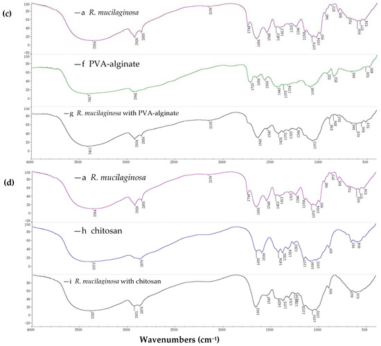 Fourier transform infrared (FTIR) for immobilization of R. mucilaginosa GIM 2.157 on agar (a), on calcium alginate (b), on PVA-alginate (c) and on chitosan (d): —a R. mucilaginosa; —b agar; —c R. mucilaginosa with agar; —d calcium alginate; —e R. mucilaginosa with calcium alginate; —f PVA-alginate; —g R. mucilaginosa with PVA-alginate; —h chitosan; —i R. mucilaginosa with chitosan.