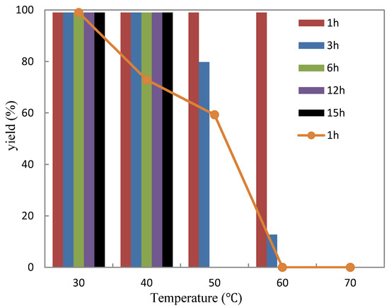 The immobilized cells are particularly interesting because of their stability with respect to higher temperatures, which makes them superior to the free cells. Hence, the thermostability of the immobilized R. mucilaginosa GIM 2.157 cells was characterized compared to that of the free resting cells. The immobilized cells were incubated at various temperatures (30–70 °C) for 1 h, 3 h, 6 h, 12 h and 15 h. The cells were added to a solution containing 10 mL Na2HPO4-KH2PO4 buffer (100 mM, pH 7.0) supplemented with substrate 1a (10 mM) and 0.5 g glucose. The reaction proceeded at 25 °C for 24 h. As shown in Figure 4, the immobilized biocatalyst showed a retention of >99% of its original activity after 15 h of incubation at 30 °C or 40 °C. The immobilized cells maintained approximately 99% of their original activity after 1 h of incubation at 50 °C or 60 °C. However, when the temperature was higher than 60 °C, a significant decrease was observed in the activity of the immobilized cells over a 3-h period. The immobilized cells were completely deactivated after 1 h at 70 °C. Free cells retained >99% of their original activity after incubation for 1 h at 30 °C. When the temperature increasing from 30 to 60 °C led to a clear reduction in the activity (27% of initial activity was lost after 1 h at 40 °C, 40% was lost after 1 h at 50 °C and total deactivation was observed after 1 h at 60 °C). It is clear that the immobilized cells have huge thermal stability advantages compared to the free cells.