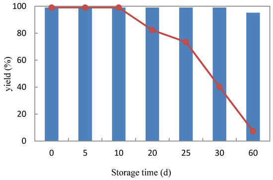 One essential factor for the practical application of whole cells is their storage stability for an extended period of time. The longer the period that a biocatalyst maintains stable, the more efficient a process is. To estimate the storage stability of R. mucilaginosa GIM 2.157, free cells and cells immobilized on agar were stored at 4 °C with physiological saline (0.85% NaCl, w/v). Samples were withdrawn at various time intervals (5, 10, 20, 25, 30, 60 days) to determine the catalytic activity at 25 °C using 1-(2-bromophenyl)ethanone (1a) as the substrate. As shown in Figure 5, the cells immobilized on agar showed a superior retention of activity comparing to free cells after storage for 60 days at 4 °C. The cells immobilized on agar maintained approximately 95% of their original activity after storage for 60 days at 4 °C, while the catalytic activity of free cells decreased to 82% after storage for 20 days at 4 °C and to 7% after storage for 60 days at 4 °C. Hence, we concluded that immobilization of R. mucilaginosa GIM 2.157 cells on agar resulted in a biocatalyst with excellent storage properties and essential industrial application potential.