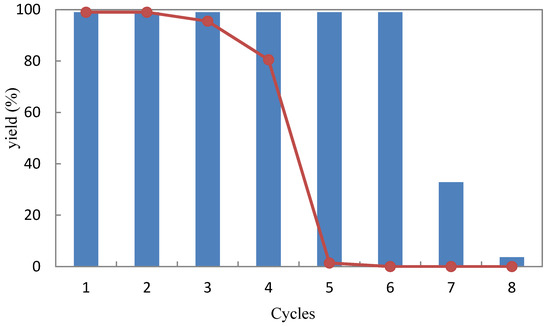 Recyclability is a crucial parameter for the practical application of an immobilized cell system. From a process economics point of view, if immobilized cells are stable for a higher number of cycles, then the process can be more efficiently operated. Thus, experiments were conducted to examine the recyclability of the free and agar-immobilized R. mucilaginosa GIM 2.157 cells for the reduction of 1-(2-bromophenyl)ethanone (1a) as an example. Each reaction was carried out in 10 mL Na2HPO4-KH2PO4 buffer (100 mM, pH 7.0) with 4.5 g immobilized cells or 3 g free cells, 10 mM substrate and 0.5 g glucose and the reactions were shaken at 25 °C for 23 h. Afterwards, the cells were separated, washed two times with the same buffer [Na2HPO4-KH2PO4 buffer (100 mM, pH 7.0)] and reused for the next batch under the same reaction conditions. R. mucilaginosa GIM 2.157 cells immobilized on agar showed high activity than free cells and completed the reduction of 1a for six cycles without significant loss of activity and selectivity. A loss of 68% of the initial activity was detected in cycle 7, whereas almost no activity (3.7% yield of alcohol) was retained in cycle 8 (Figure 6). When the free cells were used, the yield dropped to 80% at cycle 4. At cycle 5, the activity of free cells was completely lost (corresponding to the yield of 1.4%). Consequently, the immobilization of the R. mucilaginosa GIM 2.157 cells on agar provided a slight advantage for increasing the reusability of the cells, potentially making their implementation in commercial availability simpler and more cost effective.