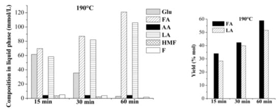 In the early stages of the experiment conducted at 190 °C, the hydrolysis of the cellulose contained in AW to give glucose was the most significant effect, giving a maximum glucose concentration of 61.6 mmol/L, after 15 min, whilst FA and LA yields were 34.1 and 28.5 mol %, respectively. By increasing the reaction time, glucose was progressively consumed up to near depletion after 60 min, whereas the yields of FA and LA obtained increased up to 59 and 52 mol %, respectively. Limited concentrations of furans (furfural and HMF) were also detected, indicating the low extent of occurred rehydration. In contrast to these last ones, whose concentration decreased during the advance of the reaction, acetic acid (AA) was a stable product from the hydrolysis of acetyl groups of biomass and its concentration remained constant at about 4.28 mmol/L during the whole reaction time.