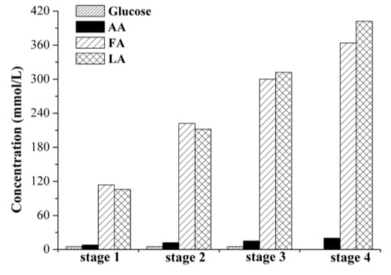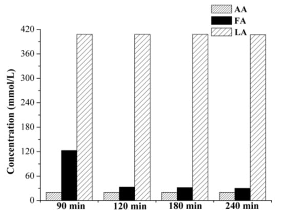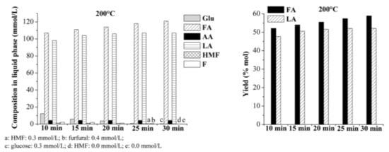 Stage 1 was performed under the conditions shown in Figure 2 at 200 °C for 20 min, and the reutilization of this liquid phase in stage 2 doubled the LA concentration, keeping the LA yield constant (52.1 mol %). Stages 3 and 4 resulted in increased LA concentrations, respectively to 312 and 402 mmol/L. In comparison, the FA concentrations increased less than proportionally, in a way that the FA/LA molar ratio achieved in the first stage (1.07) decreased below 1 in stage 3, and dropped to 0.91 after stage 4. This experimental finding can be justified on the basis of the well-known susceptibility of FA to decomposition, which has been highlighted in the literature [24,35]. The concentrations of glucose were below 1.64 mmol/L in the solutions from stages 1 to 3, whereas no measurable amount of glucose was found in the solution from stage 4.