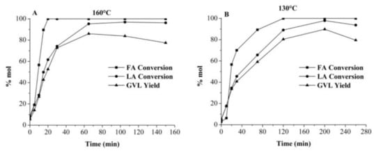 In order to increase the reaction rate, an additional experiment was performed at a higher temperature (180 °C) using the same starting conditions. The results in Figure 5B show a fast FA decomposition, with almost complete LA conversion after 120 min, and a noticeable GVL generation (with yields of 74.7 and 86 mol % after 60 and 240 min, respectively).