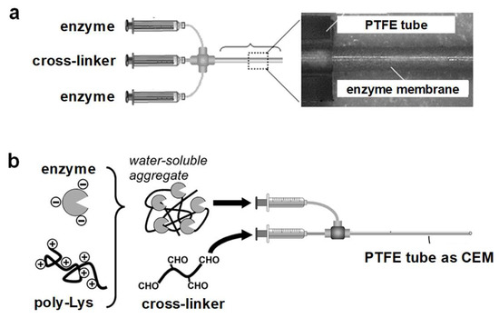 Our group developed a facile and inexpensive method for preparing an enzyme-immobilized reactor via an enzyme cross-linking reaction. Enzyme immobilization was achieved by the formation of a polymeric membrane of enzyme molecules on the inner wall of a polytetrafluoroethylene tube through cross-linking aggregation under laminar flow [25] (Figure 2a). The aggregated enzyme membrane was based on CLEAs prepared with glutaraldehyde as a cross-linker. This method for the preparation of a CLEA-based enzyme microreactor (CEM) is unsuitable for electronegative enzymes because the relative paucity of amino groups results in inefficient CLEA formation. To extend the generality of CEM preparation, we developed an improved method with poly-Lys as an aggregation booster to achieve effective aggregation of acidic enzymes [26] (Figure 2b). CEM preparation can be used for immobilization of a broad range of functional enzymes. These methods have been used to develop several enzymatic microfluidic systems [27,28,29,30]. In addition, the operational stability of enzymes in CLEAs formed by coaggregation with poly-Lys was examined [31]. Two proteases (chymotrypsin and subtilisin), an oxidase (laccase), and a multimeric enzyme (citrate synthase), which have diverse three-dimensional structures and catalytic activities, were used as model enzymes. Compared with the free enzymes, these four CLEAs were more stable at high temperatures, in the presence of a chemical denaturant, or in an organic solvent. They were recycled without appreciable loss of activity. As in the case of coaggregation with PEI, poly-Lys-supported immobilization is also applicable to multimeric enzymes [31].