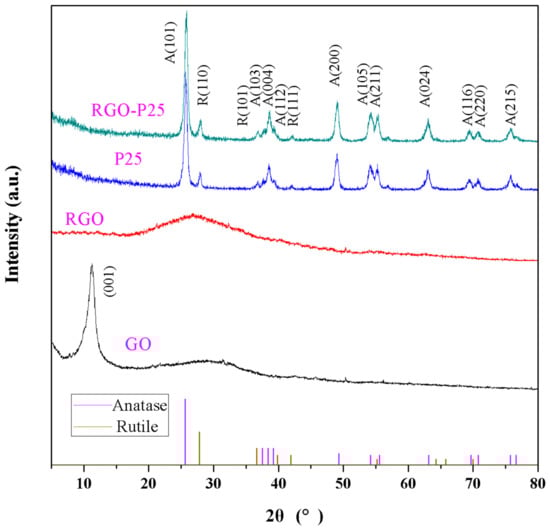 The X-ray diffraction (XRD) patterns of as-prepared graphene oxide (GO), reduced graphene oxide (RGO), P25 and compound material (RGO-P25) samples are shown in Figure 2. The XRD peak positions for GO at 2θ were 10.6°, the Bragg equation has been calculated by the 0.4052 nm, which is larger than the graphite 0.333 nm, indicating that the graphite has been oxidized, for RGO at 2θ were 26.4°, a new diffraction peak appears, which indicates that GO has been restored, for both P25 and RGO-P25 at 2θ were 25.3°, 37.8°, 49.1°, 53.9°, 55.1°, 62.7°, 70.3° and 75.1°, corresponding to planes (101), (004), (200), (105), (211), (204), (220), (215), which matches well with anatase TiO2 (JCPDS card No. 21-1272), as well as 2θ were 27.4°, 36.1°, 41.2°, corresponding to planes (110), (101), (111) which suits well with rutile TiO2 (JCPDS card No. 21-1276).