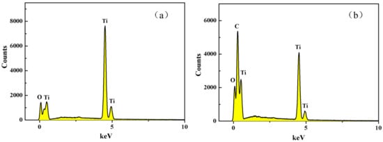 Figure 3 shows EDS of P25(a) and RGO-P25(b). Figure 3a shows that P25 contains only two elements, namely, titanium and oxygen, with a titanium content of 59.24 wt % and oxygen content of 40.76 wt %, indicating that the P25 used in this experiment has low impurity. The main element in the carrier of the sand core is Si element (Figure 1), which also indicates that the catalyst and the carrier may be bound by the Ti-O-Si bond, which greatly reduces the loss of the catalyst. However, the synthetic material RGO-P25 contains three elements: carbon (44.73 wt %), oxygen (35.19 wt %), and titanium (20.07 wt %) in Figure 3b. The carbon element in the figure may be a carbon element in the graphene material, but it may also be an impurity.