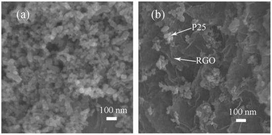 SEM images of P25 (a) and RGO-P25 (b).