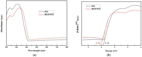 The UV-vis absorption spectroscopy (a) and the band gap (b) of both P25 and RGO-P25 samples are shown in Figure 5. The RGO-P25 has a strong absorption from 342 to 800 nm, which indicates stronger light absorption property than that of P25 (Figure 5a). Band gap information can be seen in Figure 5b exhibiting that the value of the band gap of RGO-P25 is 2.96 eV, which is lower than P25 (3.14 eV), but higher than that of nickel oxide nanoparticles [34] and hematite nanoparticles [35].