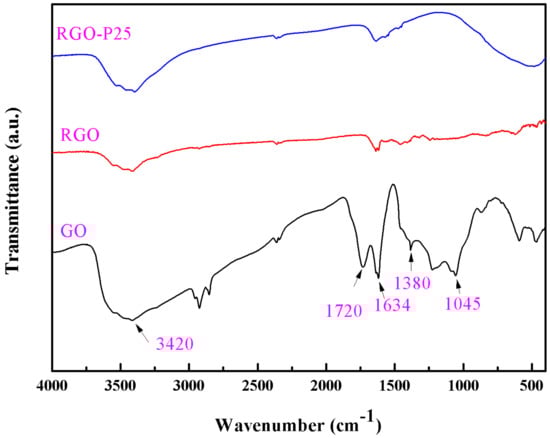 Figure 6 displays the FT-IR spectra of GO, RGO and RGO-P25. The absorption peaks at 3420 cm−1 and 1634 cm−1, which could be ascribed to the adsorbed water molecules on the particles [36,37]. The absorption peaks at 1720 cm−1 and 1045 cm−1 are attributed to the absorption of carboxylic acid C=O and the C–OH stretching vibration, separately [38]. The band observed at 1380 cm−1 is the stretching vibration of the carboxyl C–O [39]. For the RGO-P25, the strong band around 500 cm−1 should contribute to the Ti–O–Ti stretching vibration [40].