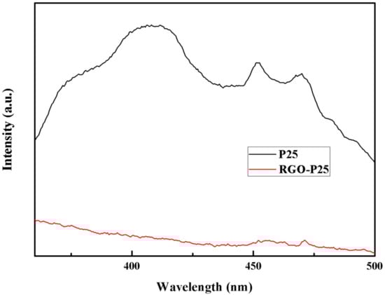 Figure 7 shows the fluorescence emission spectrum of P25 and RGO-P25. The fluorescence intensity in the fluorescence emission spectrum of a semiconductor photocatalyst can be used to characterize the recombination rate of photogenerated electrons and photogenerated holes; the lower the fluorescence intensity of photogenerated electrons is, the more effective the separation of photogenerated holes [41]. The fluorescence intensity of the composite RGO-P25 is significantly lower than that of P25, which indicates that the existence of RGO decreases the photoelectron and hole loading rate of P25, thereby enhancing its photocatalytic performance.