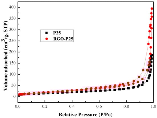 The BET spectra of P25 and RGO-P25 samples.