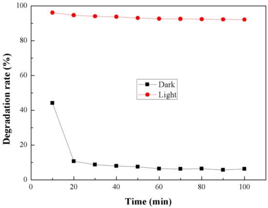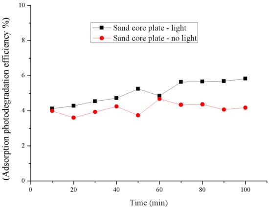 The control experiment was conducted on the blank sand core plate that was not loaded with a photocatalyst, i.e., the absorptive photocatalytic efficiency of the blank sand core plate on NH3 gas was measured in the presence or absence of light (Figure 9) within 100 min; under the conditions of both no light and light, the degradation efficiency of the blank sand core plate carrier on ammonia is 5% ± 1%, and the efficiency is not obviously improved, which means that the carrier of the sand core plate itself hardly occurs photolysis. At the same time, the absorbability of the core plate on the ammonia gas is not strong. The degradation rate of light is slightly lower than that of no light. It is possible that the temperature produced by light affects the stability of the gas.