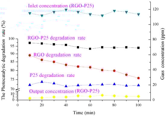 Figure 10 shows that the degradation efficiency of RGO-P25 was as high as 97.39% within 50 min of the reaction. With the prolongation of reaction time, the degradation efficiency slightly decreased, and the degradation effect remained stable from 70 min to 100 min later, maintaining efficiency at around 94%. The blank sand core plate used in this experiment did not impart a photocatalytic degradation effect on ammonia (Figure 8). These findings indicate that most of the ammonia gas was decomposed by the RGO-P25 catalyst, and the catalytic performance was stable. Combining the adsorptive capability of activated carbon and the photocatalytic activity of P25, RGO-P25 shows superior photocatalytic ability. On the one hand, P25 prolongs the service life of sand core plates and improves the efficiency of ammonia degradation. On the other hand, the lamellar fold structure of RGO can maximize the amount of ammonia adsorbed on the surface of the composite material, providing an effective degradation environment for photocatalytic reaction. In addition, certain characteristics of RGO such as high loading and large specific surface area have expanded the reaction contact area, thereby improving the photocatalytic performance of RGO-P25. Due to the instability of the gas distribution, the degradation efficiency of the composite material is unstable during the reaction. During the early stages of the reaction, the adsorption capacity of the sand core plate reaches equilibrium, thereby causing a decrease in degradation efficiency. The photocatalytic effect tends to be stable in the later stages, mainly due to the Si-O-Ti bond formed between the silicon element and the interface of P25 phase, maintaining the stability of the catalytic activity of titanium dioxide P25 [42].