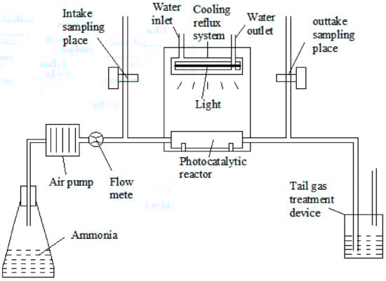 Ammonia gas was pumped through an air flow meter (air pump pressure: 8 kp). The flow rate was adjusted to the value required by the experiment, and the photocatalytic reaction took place in a tubular reactor. The temperature inside the reactor was kept constant by using a low temperature circulating condenser. Sampling ports were set at the inlet and outlet of the photocatalytic reactor. During the experiment, the gas chromatograph was used to determine the concentration of ammonia before and after the reaction. After each experiment, the pipe was blown with nitrogen to prepare for the next experiment. Ammonia gas detection device (REA, Huari Scientific Instruments Co., Ltd., San Francisco, CA, USA, 0.1 ppm).