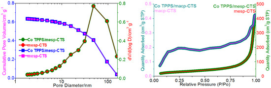 BJH pore-size distribution of Co TPPS/mesp-CTS, mesp-CTS; BET adsorption isothermal plot of Co TPPS/mesp-CTS, mesp-CTS, Co TPPS/macp-CTS and macp-CTS.
