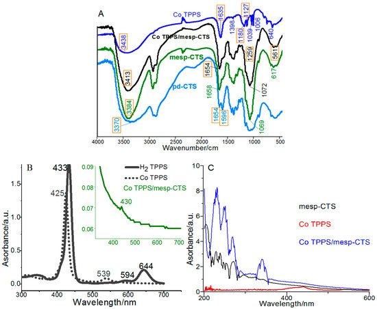(A) Fourier transform infrared (FT-IR) spectra of Co TPPS/mesp-CTS (or Co TPPS/macp-CTS), Co TPPS, mesp-(or macp-)CTS and, powdered chitosan (pd-CTS), with an effective frequency range of 400–4000 cm; (B) ultraviolet-visible(UV-vis) spectra of an aqueous solution of H2 TPPS (ε = 5.3 × 10 L·mol cm) and Co TPPS (ε = 2.7 × 10 L·mol cm) and an aqueous suspension of Co TPPS/mesp-CTS(or Co TPPS/macp-CTS) (ε = 0.4 × 10 L·mol cm); and (C) UV-DRS (vis diffuse reflectance spectra) spectra of mesp-CTS(or macp-CTS), Co TPPS, and Co TPPS/mesp-CTS (or Co TPPS/macp-CTS).