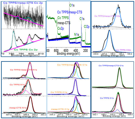 X-ray photoelectron spectra and main spectral bands based on the binding energy (BE) of the key elements (Co, Cl, N, and O) forCo (TPPS), Co (TPPS)/mesp-CTS, and mesp-CTS.