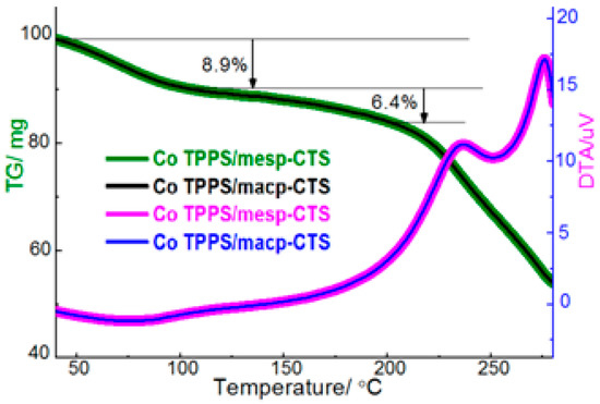 To examine the thermal stability of Co TPPS/mesp-CTS and Co TPPS/macp-CTS, thermogravimetric (TG) and differential scanning calorimetry (DSC) curves were recorded, as shown in Figure 5. There were two steps in their mass processes; the first mass loss step (~8.9%) occurred at a temperature lower than 100 °C, whereas the second mass loss step (~6.4%) occurred between 100–180 °C. The first mass loss step was likely because of the escape of intermolecular water from mesp-CTS or macp-CTS, while the second mass loss step resulted from the decomposition of intramolecular water from mesp-CTS or macp-CTS. The immobilized Co porphyrin did not decompose at 150 °C. This finding was expected, because a previous report indicated that decomposition of cobalt porphyrin required a temperature greater than 370 °C [54].