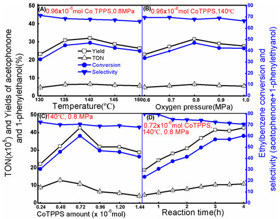Figure 6D shows the effect of time on ethylbenzene oxidation. The ethylbenzene conversion rate and the yields of major products increased rapidly from 0–3 h, but increased slowly from 3–4 h. It is likely that the products formed during oxidation covered the surface of the solid catalyst, leading to catalyst activation oppression [59]. Although selectivity (acetophenone and 1-phenylethanol) decreased slowly before the fourth hour, while the catalyst TON increased slightly, these changes were insignificant. Therefore, a 4-h reaction time is optimal for the oxidation of ethylbenzene over Co TPPS/mesp-CTS.