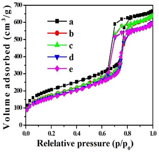 The mesoporous structure of the samples was also studied by nitrogen adsorption-desorption. As displayed in Figure 2, the isotherms of the 0.2%Pd/SBA-15 (b) and 0.2%Pd-x%Ni/SBA-15 (c–e) samples exhibited a representative IV isotherm with an obvious hysteresis loop in the range of P/P0 of 0.6–0.8. The supported catalysts displayed cylindrical channels with a narrow pore size distribution and were similar to the parent SBA-15 (a), which was inconsistent with the result of low-angle XRD.