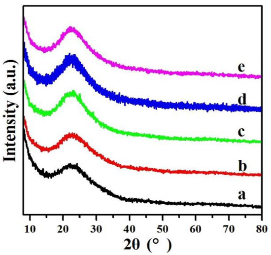 The wide-angle XRD patterns for the 0.2%Pd/SBA-15 (b) and 0.2%Pd-x%Ni/SBA-15 (c–e) samples are displayed in Figure 3. As shown in the figure, all samples presented a broad peak of SiO2 at approximately 22.5°. In addition, there were not the diffraction peaks of Pd and Ni, meaning that the Pd and Ni nanoparticles were highly dispersed on the support, which is consistent with previous reports [40,41]. After increasing the Pd loading amount to 0.9%Pd/SBA-15, the XRD pattern of the samples displayed a characteristic peak at 39.2° (Figure S2), matching the Pd (111) plane with a face-centered cubic (fcc) structure, whereas the peak belonging to Ni was invisible for all samples. In addition, the reflection peak of Pd (111) clearly shifted to a high angle direction and its intensity gradually reduced along with the increase in Ni loading amount. Moreover, the reflection peak of Pd (111) could not be observed for 0.9%Pd-1.2%Ni/SBA-15, indicating that the modification of Ni could improve the dispersion of Pd nanoparticles on the SBA-15 support and achieve a much smaller Pd particle size. This could be illustrated by the strong interaction of Pd and Ni and that the addition of Ni can inhibit the growth of Pd nanoparticles.