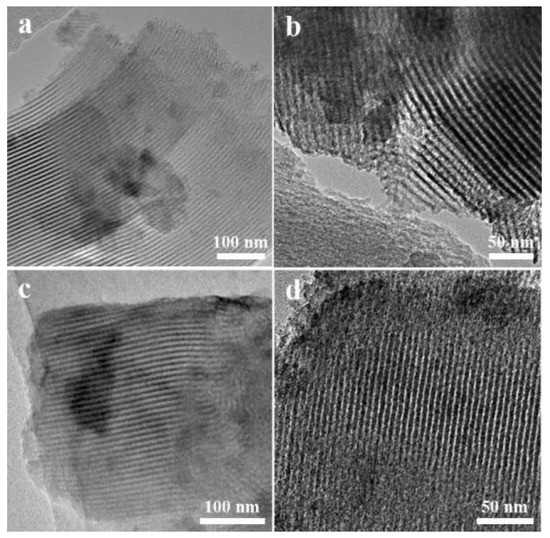 TEM images of (a,b) 0.2%Pd/SBA-15; (c,d) 0.2%Pd-1.2%Ni/SBA-15.