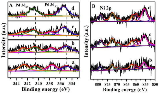 In order to examine the surface properties and the electronic states of Pd, the X-ray photoemission spectroscopy (XPS) analysis was conducted for the 0.2%Pd/SBA-15 and 0.2%Pd-x%Ni/SBA-15 catalysts. As illustrated in Figure 5A, the XPS in the range of 333–345 eV was ascribed to the Pd3d region. The Pd3d5/2 and Pd3d3/2 peaks at higher binding energies (337.6 and 342.7 eV) were described to the Pd2+ species and the Pd3d5/2 and Pd3d3/2 peaks at lower binding energies (335.0 and 340.6 eV) were attributed to the Pd0 (metallic palladium) [30,42]. However, there was a shift of 0.1–0.5 eV towards high binding energy for three 0.2%Pd-x%Ni/SBA-15 (b–d) bimetallic catalysts with respect to the 0.2%Pd/SBA-15 (a) catalyst, which can be ascribed to the reduction in the particle size of Pd with the addition of Ni [43,44,45]. The above result further proved that the introduction of Ni could better disperse the Pd nanoparticles and was in line with the results of the wide-angle XRD and TEM analysis.