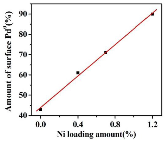In addition, the shift to the high binding energy of Pd also suggested that the surface charge density of Pd particles increased with the amount of Ni. In order to quantify the surface Pd species, the contents of the surface Pd0 and Pd2+ species were calculated by the relative peak area listed in Table 2. The fractions of the Pd0 and Pd2+ species in 0.2%Pd/SBA-15 were approximately 43% and 57%, respectively. It is notable that the content of metallic Pd0 increased from 61% to 90% upon increasing the Ni loading amount from 0.4 wt % to 1.2 wt %, which revealed an electron transfer from Ni to Pd, consequently leading to the increase in the surface Pd0 species. Interestingly, a good linear relationship of the amount of surface Pd0 against the Ni loading amount was found on the 0.2%Pd-x%Ni/SBA-15 catalysts presented in Figure 6. The above results confirmed that the presence of Ni could significantly improve the formation of surface Pd0, which is in keeping with the results from the reported literature [46].