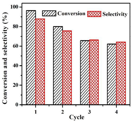 It should be noted that the stability of the catalysts in the hydrogenation of CAL to HALD is very important. Thus, the reusability of 0.2%Pd-1.2%Ni/SBA-15 was further studied (Figure 7). The used catalyst was separated by centrifugation with isopropanol several times after each test. It was observed that the CAL conversion and HALD selectivity decreased to 80.1% and 75.7% after two cycles of the catalyst, respectively. After the third cycle, the conversion and selectivity decreased to 65.7% and 66.4%, respectively. It was noteworthy that the catalyst remained stable up to forth uses, both the conversion of CAL and the selectivity to HALD were maintained at about 60.0%. In order to find the reasons for deactivation, the 0.2%Pd-1.2%Ni/SBA-15 catalyst after two runs was characterized by XRF (Table 1), low-angle XRD (Figure S4), wide-angle XRD (Figure S5), N2 adsorption-desorption measurements (Table 1), and XPS (Figure S6). The XRF analysis indicated that the Pd and Ni contents of the 0.2%Pd-1.2%Ni/SBA-15-used catalyst were about 0.17 wt % and 1.20 wt %, respectively, which suggested that there was trace leaching of Pd and Ni during the catalytic reactions. Therefore, the slight loss of metals was not the reason for the catalyst deactivation. In addition, when compared with the fresh 0.2%Pd-1.2%Ni/SBA-15 sample, the results of the low-angle XRD, wide-angle XRD as well as the N2 adsorption-desorption of the reused catalyst were almost unchanged after twice recycling. However, a significant change of the surface Pd species was observed for the used catalyst. As shown in Table 2, the fraction of the Pd0 species decreased from 90% to 79%. The larger Pd2+ content on the catalyst surface contributed to the formation of side products with high-molecular weights. In other words, the deactivation reason can be ascribed to the reduction of the Pd0 amount on the surface of the 0.2%Pd-1.2%Ni/SBA-15 catalyst [58,61]. In addition, the used catalyst was reduced with hydrogen, and the activity for CAL hydrogenation was measured. The results showed that the CAL conversion and the HALD selectivity reached 85.1% and 84.0% over the reduced used catalyst, respectively. Therefore, the catalyst could partially restore its catalytic activity through reduction.
