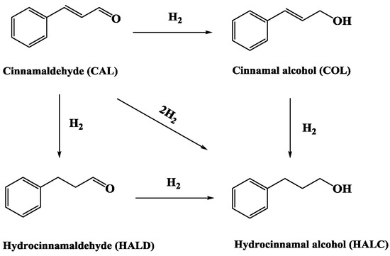 The selective catalytic hydrogenation of α, β-unsaturated carbonyl compounds to unsaturated alcohols or saturated aldehydes is an important step for the production of a great deal of chemicals, for instance, pharmaceuticals, spices, and fragrances [1,2,3]. Cinnamaldehyde (CAL) is a typical α, β-unsaturated aldehyde, which can produce various product distributions through its hydrogenation route (Scheme 1). Recently, hydrocinnamaldehyde (HALD), obtained by C=C hydrogenation, was considered as a vital intermediate in the process of synthesizing pharmaceuticals, which could be applied in HIV treatment [4,5]. Although the reduction of the C=C group is favorable thermodynamically relative to the activation of the C=O group, developing high-performance catalysts to improve the selectivity of C=C hydrogenation is still a great challenge.