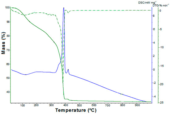 The thermal decomposition of the coordination compound (Figure 2) occurs in the 25–450 °C temperature range, and is characterized by a four-stage mass loss. During the first endothermic step (25–150 °C, mass loss (found/calc.) = 9.75/10.26%) is eliminated the lattice water. The second decomposition stage (150–321 °C, mass loss (found/calc.) = 14.83/15.39%) corresponds to the removal of the six coordinated molecules of water. The oxidative degradation of oxalate occurs in the third step (321–406 °C), and the mass loss ((found/calc.) = 40.69/41.06%) indicates the obtaining of a mixture of oxides: zinc oxide and nonstoichiometric oxide Cr2O3+x, x = 0.25. This assumption is supported by the existence of the fourth decomposition stage (406–450 °C). In this decomposition process, the continuous mass loss assigned to oxygen evolving is in agreement with the data from literature [35,37], and represents the formation of Cr2O3 followed by obtaining the zinc chromite.