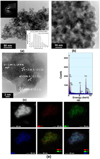 Morphology, crystallinity, and compositional uniformity of ZnCr2O4 powder calcined at 800 °C: (a) TEM image showing a general view of several particles of different size and shape—insets show the SAED pattern and histogram indicating the particle size distribution; (b) TEM image showing details of a few polyhedral particles; (c) HR-TEM image; (d) EDX spectrum; (e) STEM image and elemental (at. %) mapping performed on five ZnCr2O4 particles.