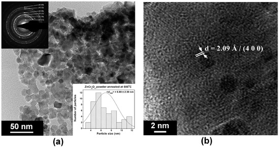 Morphology and crystallinity of ZnCr2O4 powder calcined at 600 °C: (a) TEM image showing a general view of a large aggregate of nanosized particles—insets show the SAED pattern and histogram indicating the particle size distribution; (b) HR-TEM image.