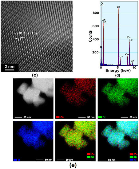 EDX spectra of Figure 5d and Figure 8d reveal only the presence of the Zn, Cr, and O species. No other foreign cations were identified, which proves the lack of any contamination during the synthesis process and the high purity degree of the as-prepared powdered samples.