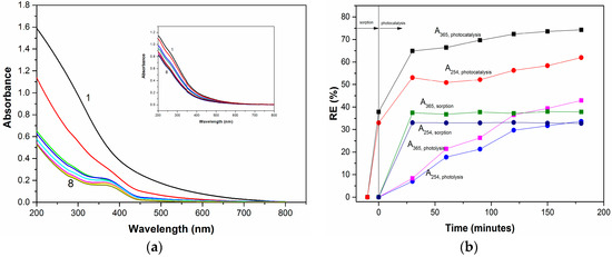 The initial UV-VIS spectrum profile for 50 mg/L HA and its evolution during the photocatalysis using ZnCr2O4 (450 °C) is shown in Figure 10a, in comparison to the photolysis process (inset of Figure 10a). Absorbance recorded at wavelengths 254 nm and 365 nm is considered to be a suitable parameter for the characterization of aquatic humic substances, selected due to the fact that they indicate the presence of aromatic compounds. The aromatic compounds derived from an aquatic heterotrophic metabolism consist of nitrogen-based functions characterized by the chromophore characteristics. The comparative results of photocatalysis involving the prior sorption step for 30 min, photolysis under UV irradiation, and sorption under dark conditions, as well as the application results applied for HA removal from water expressed as RE (%), are shown in Figure 10b.