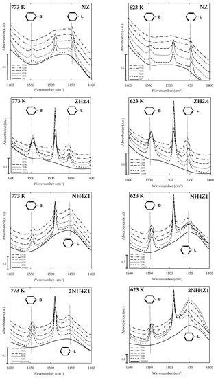 A progressive thermal desorption procedure was conducted (up to 773 K) in order to evaluate the strength of Brønsted and Lewis acid sites. Pyridine-saturated zeolite samples were subjected to vacuum at 423, 523, 623, 723, and 773 K. After heating to the desired temperature, samples were cooled down to 293 K to register the corresponding spectrum.