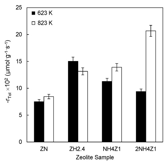 Thus, the highest reaction rate was attained when the 2NH4Z1 sample out-gassed at 823 K was used. Such a result could be related to the highest density of Lewis acid sites (282.8 µmol·g−1) of this sample after thermal treatment. Several studies have reported the role of Lewis acid sites on the generation of active atomic oxygen species. Such species could react with adsorbed toluene on the surface of zeolite samples, as represented by Equation (2) [33,34,35,36,37].