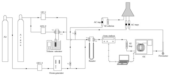 Ozone was generated from dry air (analytical grade) using an AZCOZON ozone generator (AZCO Industries Limited Langley, BC, Canada). A toluene stream was produced in situ by bubbling argon in a closed glass flask containing liquid toluene, which was then immersed in a temperature-controlled bath at 261 K. Both procedures are explained in detail in another publication [25].