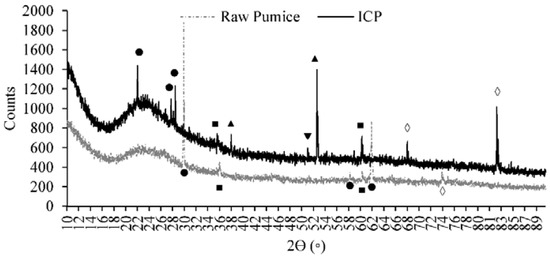 X-ray Diffraction (XRD) is the most commonly used analytical technique for determining the phase composition, grain size, and crystal structure of materials. According to the distribution of the pigments, the composition of the material can be qualitatively analyzed by comparing the powder diffraction. XRD analysis of the catalysts was carried out at room temperature within the Bragg angle range 10° ≤ 2θ ≤ 90° at a scan speed of 2° min−1 by an X-ray diffractometer, using Cu Kα-radiation (λ = 1.54060 Ǻ). The XRD diffractogram was evaluated according to the diffractometer-based DIFFRAC EVA software (V4 Flyer, Bruker AXS, Karlsruhe, Germany) and ICCD (International Center for Diffraction Data). The XRD diffractogram and ICCD obtained in the detection limits of the device are matched, and the XRD analysis results of the raw and iron-coated pumice are shown in Figure 2.