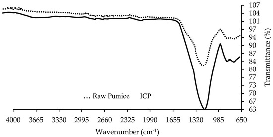 FT-IR spectrum of raw and iron-coated pumice samples.