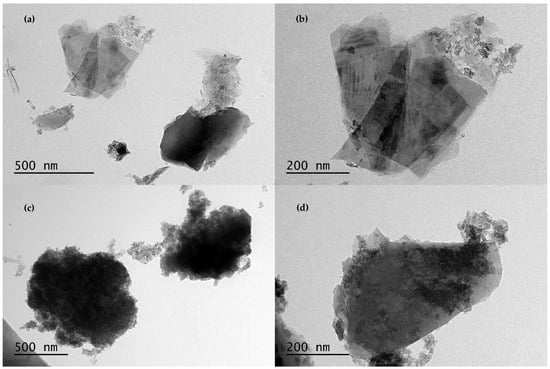 TEM photograph of the catalyst; (a,b) Raw Pumice and (c,d) Iron Coated Pumice